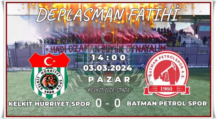 TFF 3. lig 2. grupta mücadele eden yeşil beyazlı temsilcimiz 1954 Kelkit Hürriyet Spor'un, ligin 22. haftasında evinde Batman Petrolspor’u konuk ettiği karşılaşma 0-0 beraberlikle sonuçlandı.