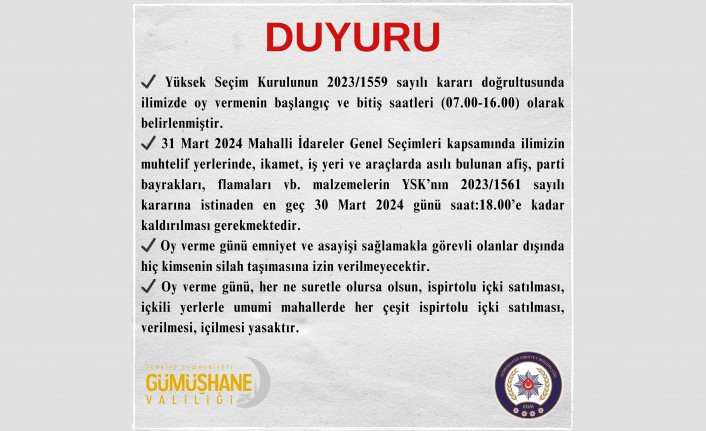 Valilikten yapılan açıklamada Yüksek Seçim Kurulunun 2023/1559 sayılı kararı gereği Gümüşhane'de oy verme işlemlerinin başlangıç saatinin 07.00, bitiş saatinin ise 16.00 olarak belirlendiği hatırlatılarak, “31 Mart 2024 Mahalli İdareler Genel Seçimleri kapsamında ilimizin muhtelif yerlerinde, ikamet, iş yeri ve araçlarda asılı bulunan afiş, parti bayrakları, flamaları vb. malzemelerin YSK'nın 2023/1561 sayılı kararına istinaden en geç 30 Mart 2024 günü saat 18.00'e kadar kaldırılması gerekmektedir” denildi.