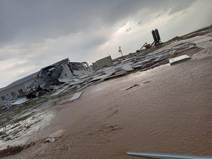 Yağışın en çok vurduğu yerlerden birisi olan havalimanı inşaatındaki prefabrik şantiye binalarının çatıları ve metal aksamları etrafa savrulurken, şantiyedeki işçi koğuşlarının tamamı kullanılamaz hale geldi.